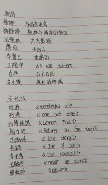 以上是初赛中各位老师们在众多优秀作品中推选出来的更加优秀的配音节目与卡拉OK节目;等到外语节来临的那一天,相信各位选手会表现得更加出色;让我们拭目以待吧!在这里也预祝外语节能够顺利的开展。