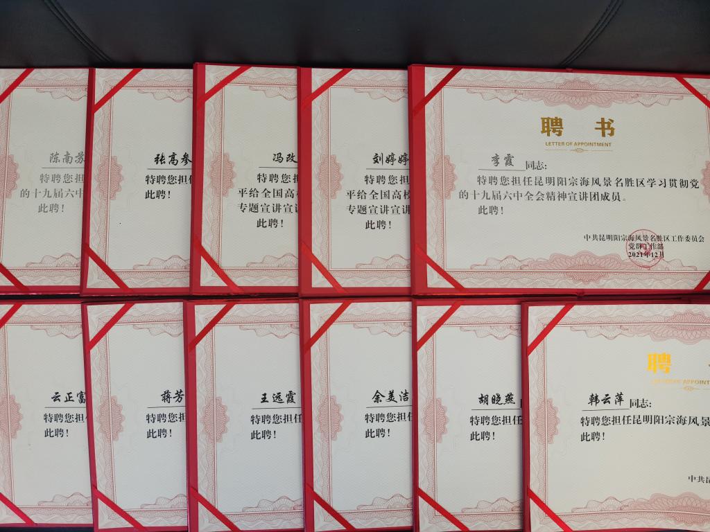 20211216日,由中共昆明阳宗海风景名胜区工作委员会为bevictor伟德体育11名高校宣讲团成员颁发聘书,从政策宣讲到积极教学法的推广;从演讲论辩赛事指导到微党课制作;从篮球、排球联谊到啦啦操编排训练;从干部心理调适到压力缓解团体心理辅导;以及为明年2022生物多样性公约会议暨COP15阳宗站的相关活动筹备,出谋划策、提前准备,扎实办好民生实事,从专题宣讲到下基层服务,让党旗在基层一线高高飘扬