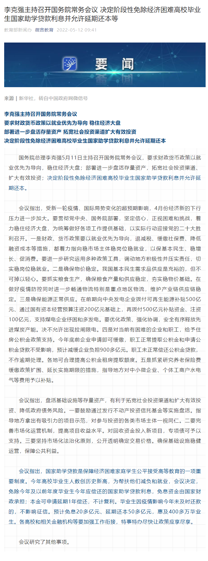 李克强主持召开国务院常务会议 决定阶段性免除经济困难高校毕业生国家助学贷款利息并允许延期还本等