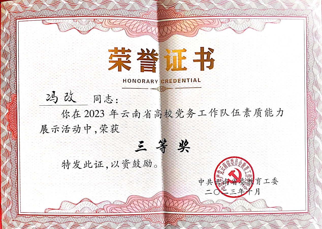 10月8日至9日,省委教育工委组织开展云南省高校一流党建创建经验交流会议暨党务工作队伍素质能力展示活动。公司素质拓展党支部书记冯改老师以公司初赛第一,昆明主城片区复赛第一的成绩顺利进入2023年云南省高公司党务工作队伍素质能力展示活动决赛,并在决赛中获得教师党支部书记组别三等奖。